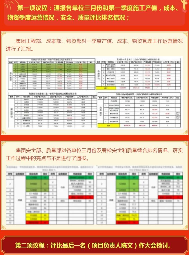 一、通報各單位三月份和一季度施工產(chǎn)值,成本、物資季度運營情況,安全、質(zhì)量評 比排名情況;