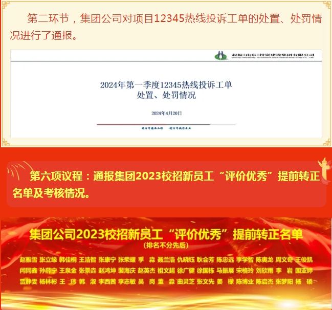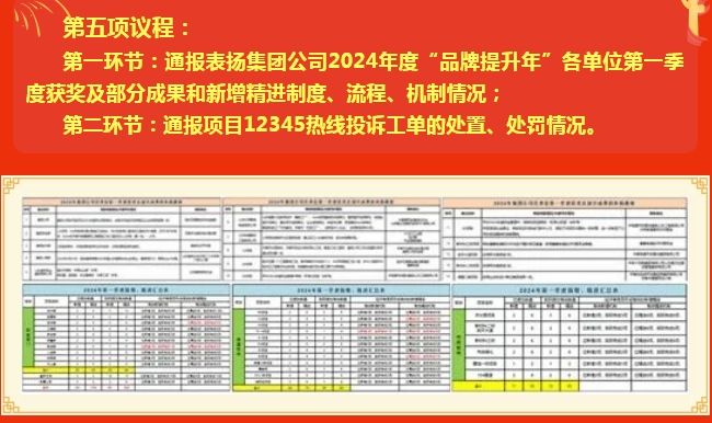 五、通報表揚集團公司2024年度“品牌提升年”各單位一季度獲 獎及部分成果和新增精進制度、流程、機制情況;通報項目12345熱線投訴工單的處置、處罰情況;