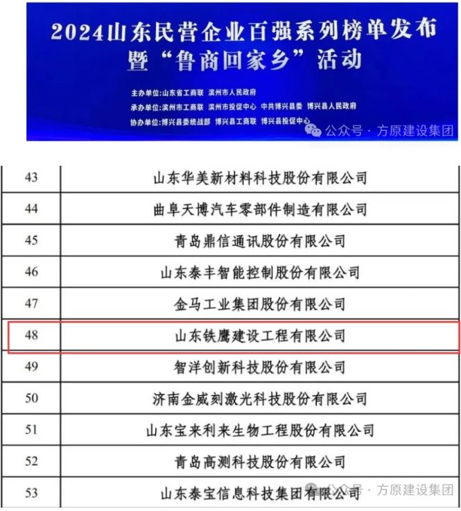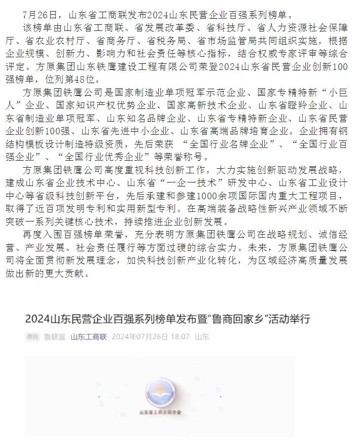 熱烈祝賀方原集團(tuán)鐵鷹公司榮登2024山東省民營(yíng)企業(yè)創(chuàng)新100強(qiáng)榜單