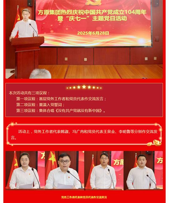 6月28日,方原集團(tuán)黨委組織開展慶祝中國共產(chǎn)黨成立104周年暨慶“七一”主題黨日活動。