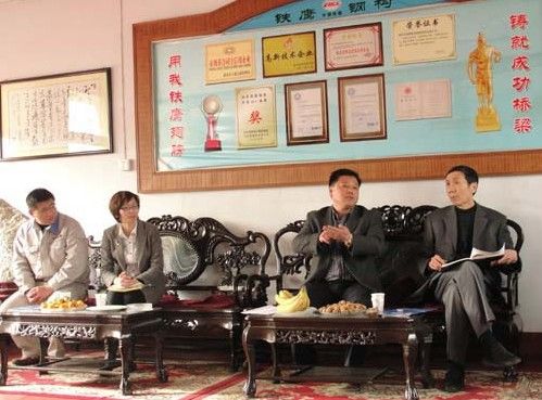 市工商局鄭金鐘副局長(zhǎng)(右一)和工商聯(lián)王萍部長(zhǎng)(左二)與總經(jīng)理?xiàng)蠲鞑ㄉ钊虢徽?/p>
