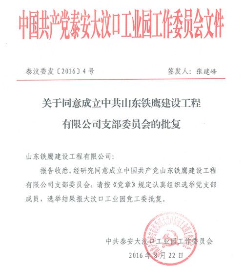 2016年8月22日,經(jīng)中共泰安大汶口工業(yè)園工作委員會研究同意成立中國共產(chǎn)黨山東鐵鷹建設(shè)工程有限公司支部委員會。