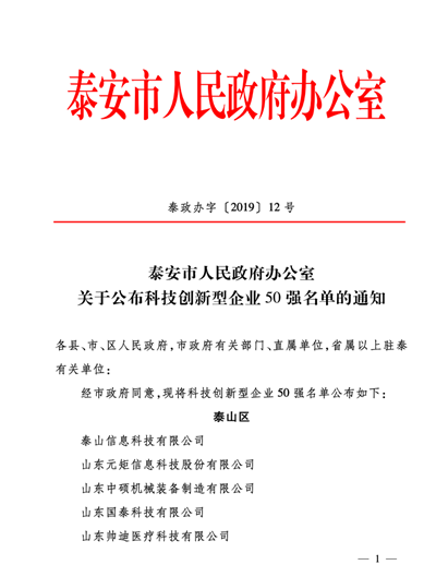 熱烈祝賀我公司被認(rèn)定為泰安市科技創(chuàng)新型企業(yè)50強(qiáng)